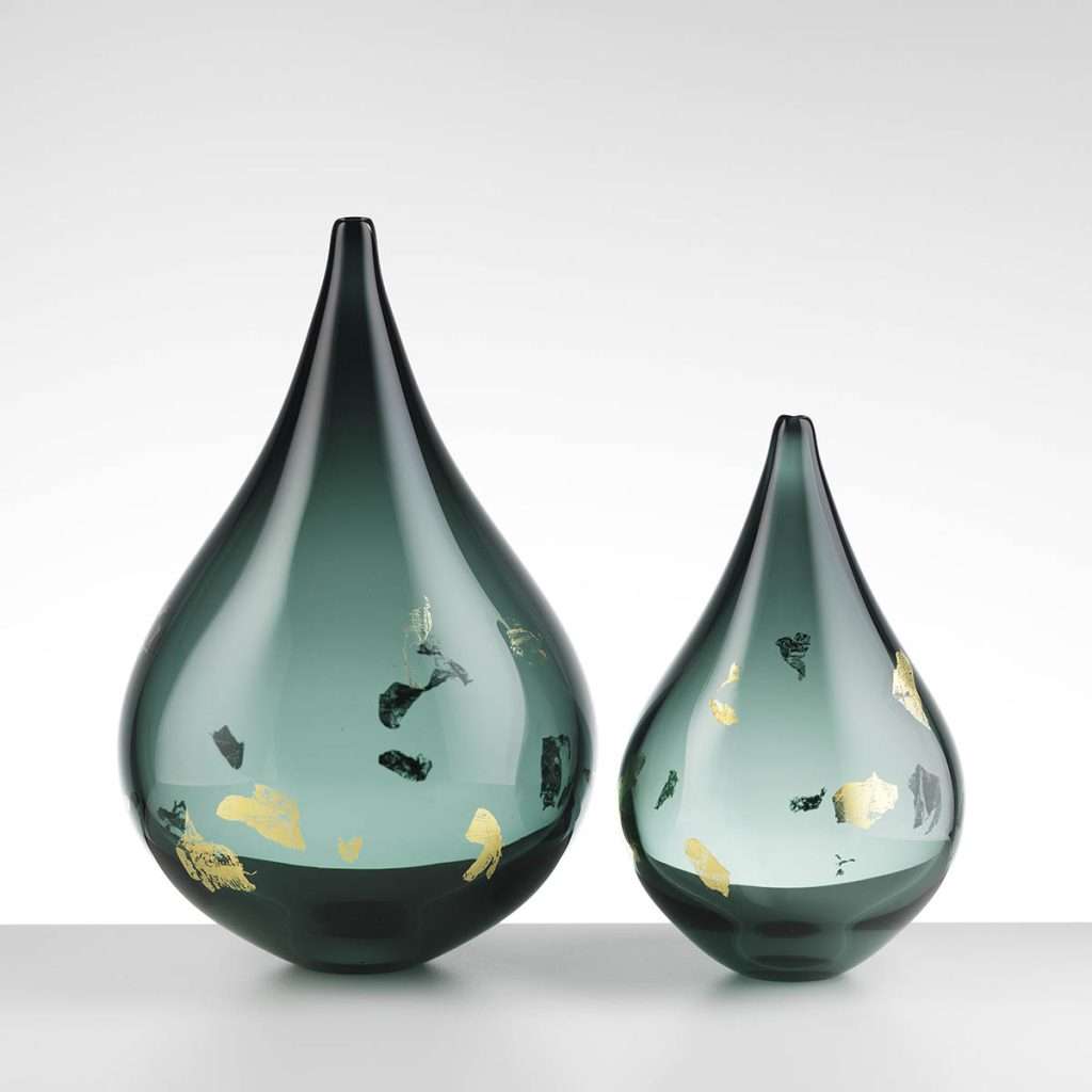 Glass artist Elin Isaksson makes hand-blown luxury pieces for interiors. Forms often reveal a sense of movement, capturing the inherent energy and fluidity of working with molten glass. Her elegant Droplet Ornaments contain 23.5 carat gold leaf.