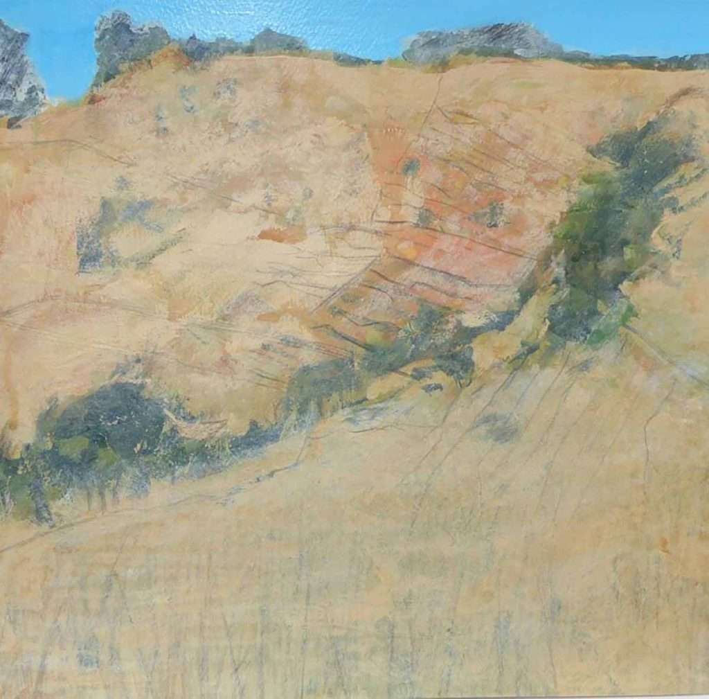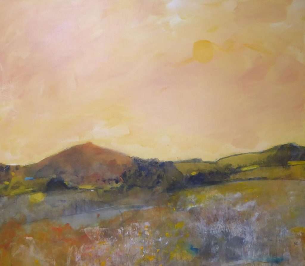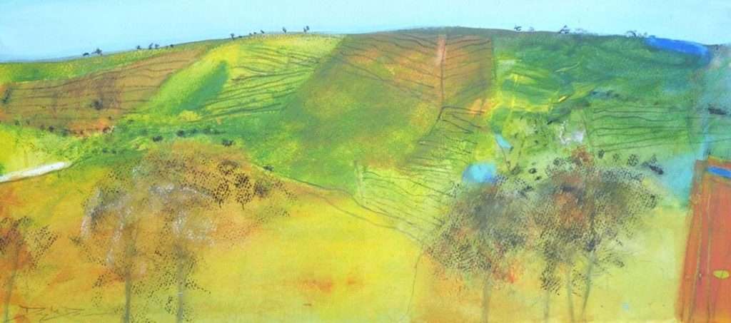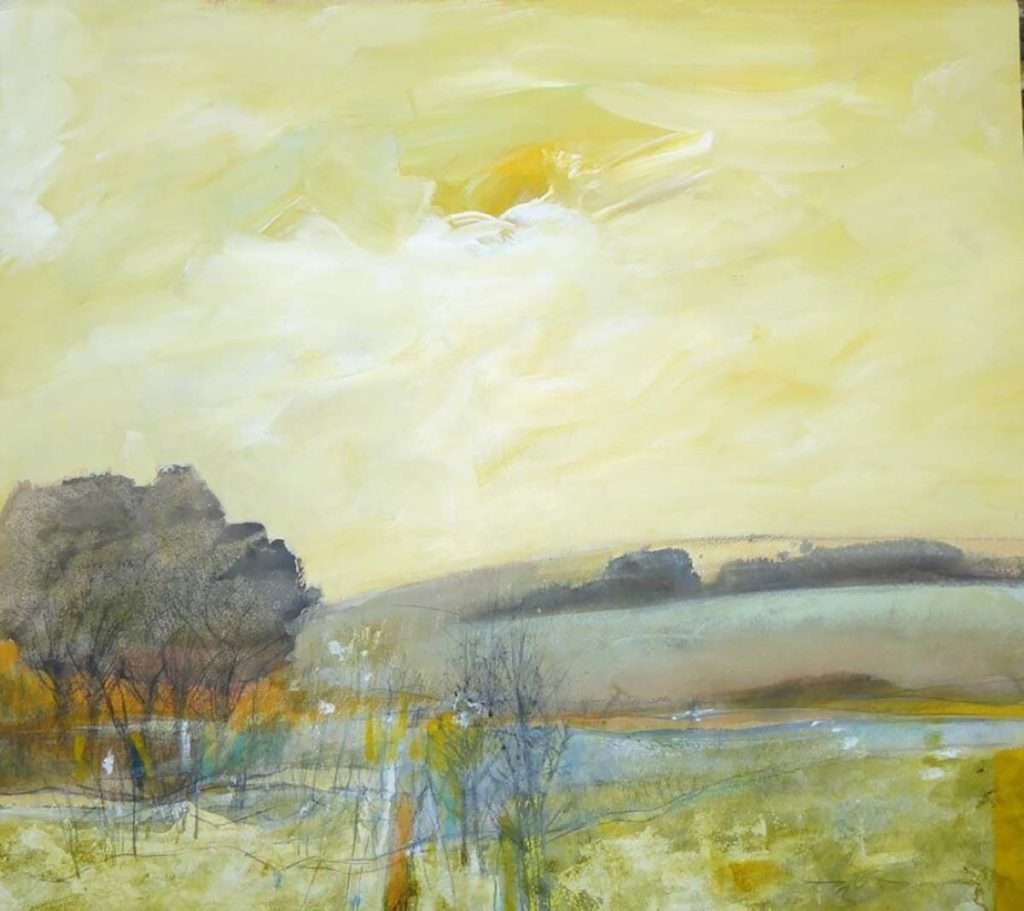 As well as an accomplished watercolourist, the medium in this collection is acrylic, often blended with pastel and pencil. A recurring focus is the shifting quality of light, as observed in The Duck Pond, with a vibrant lemon sky bathing the curving contours of hills, woodland, meadow and pond in a pale golden glow.