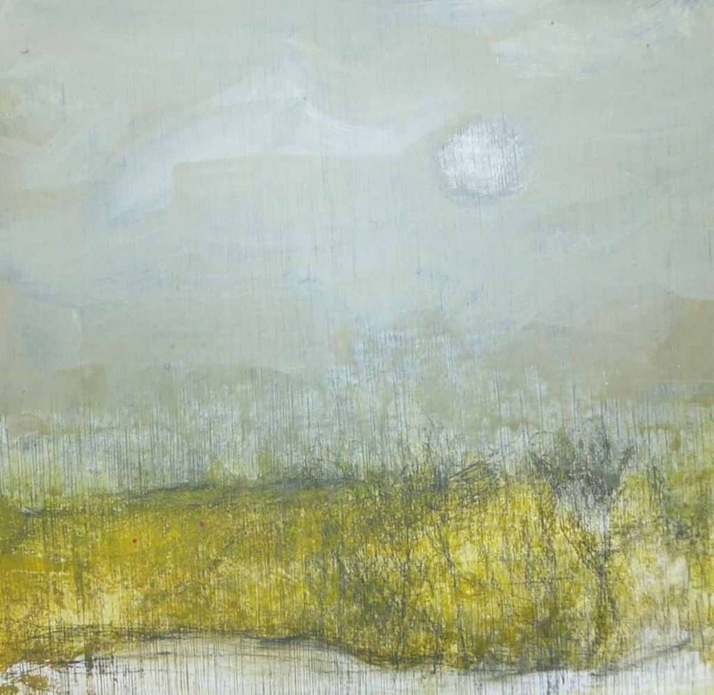 Davies studied Ceramics and Glass Design at Edinburgh College of Art, and perhaps it’s this decorative skill which is translated in the controlled use of line and shape with crisp tone and texture. Rather than dramatic vistas, he experiments in depicting subtle elements: the shimmering glare of Mediterranean sun, a slant of winter light over frosty fields and a hazy mist like a lacy veil in Grasses, with a delicate touch.