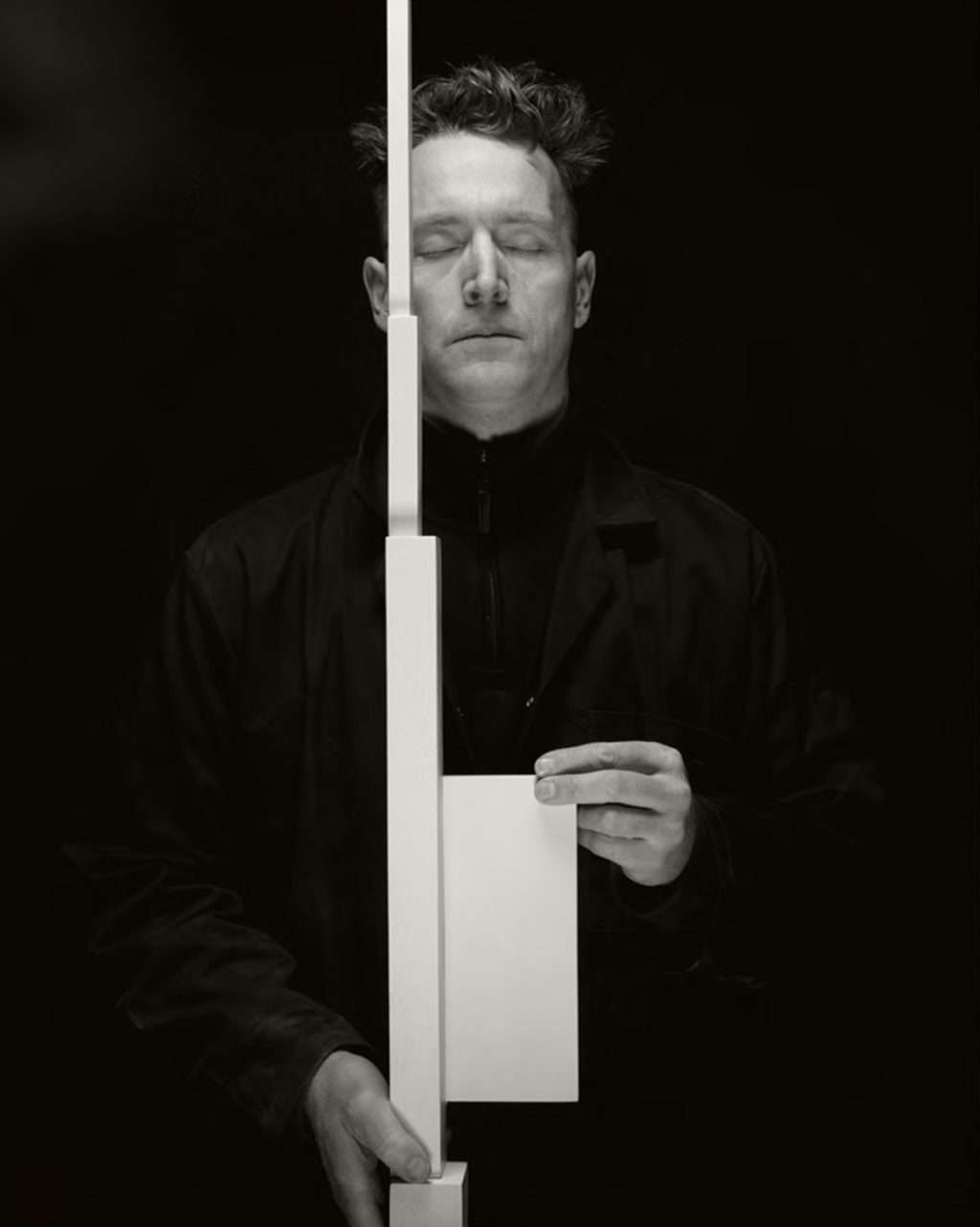 The black and white image of furniture maker David Watson conveys something of the Bauhaus movement, with David holding different sections of wood in a sculptural grouping, and having his eyes closed somehow signals that he is thinking about forms he is going to create.