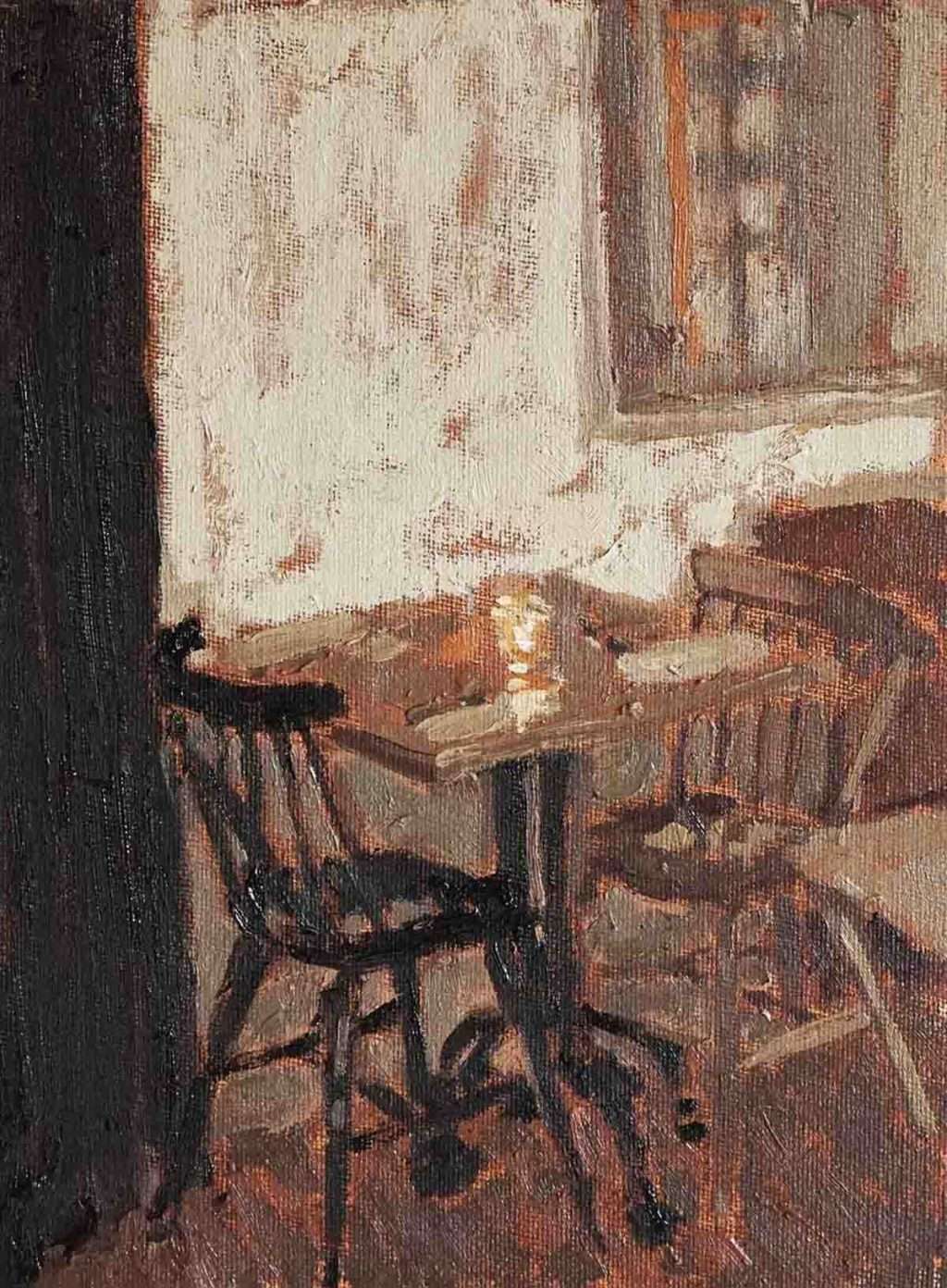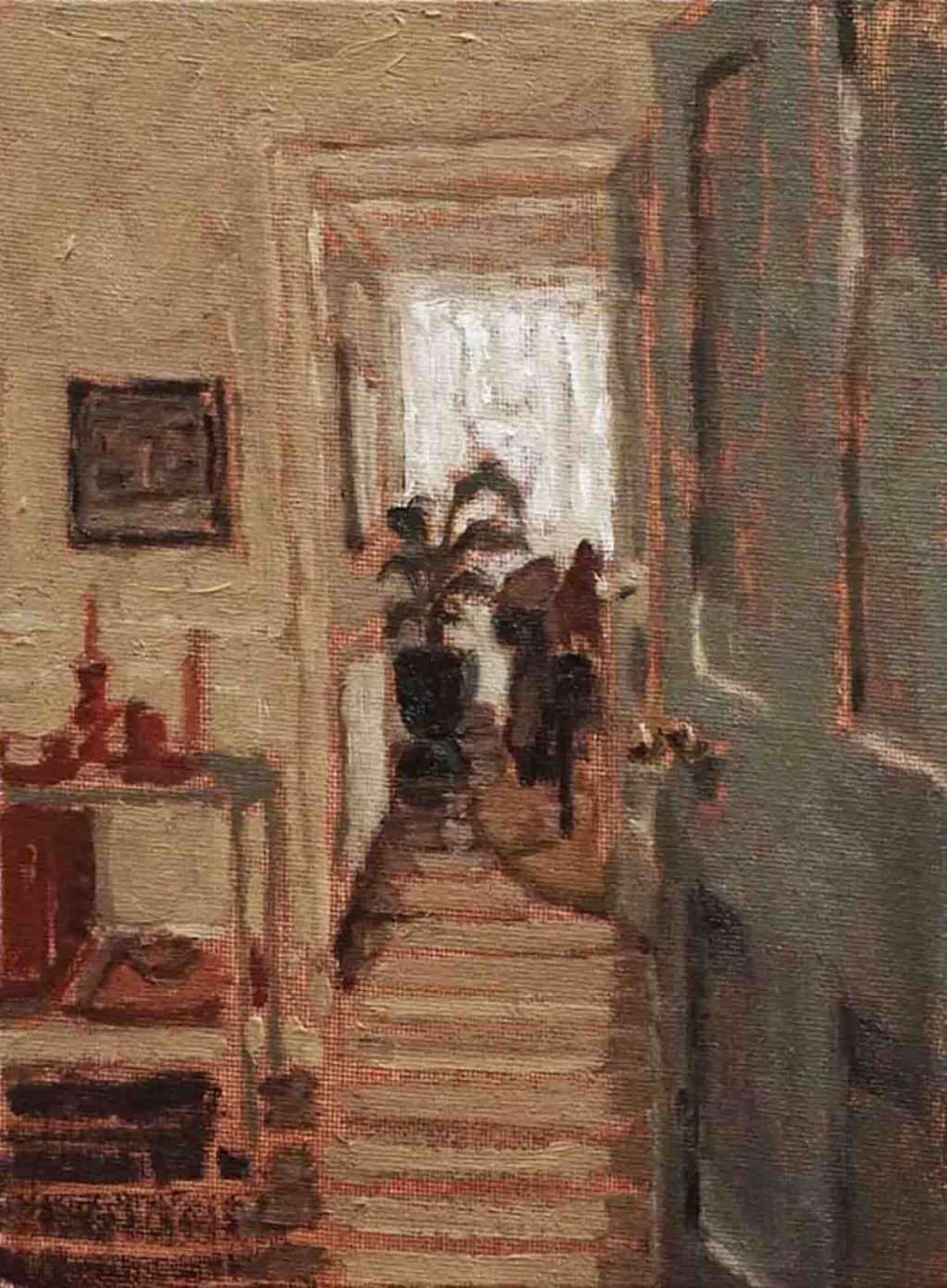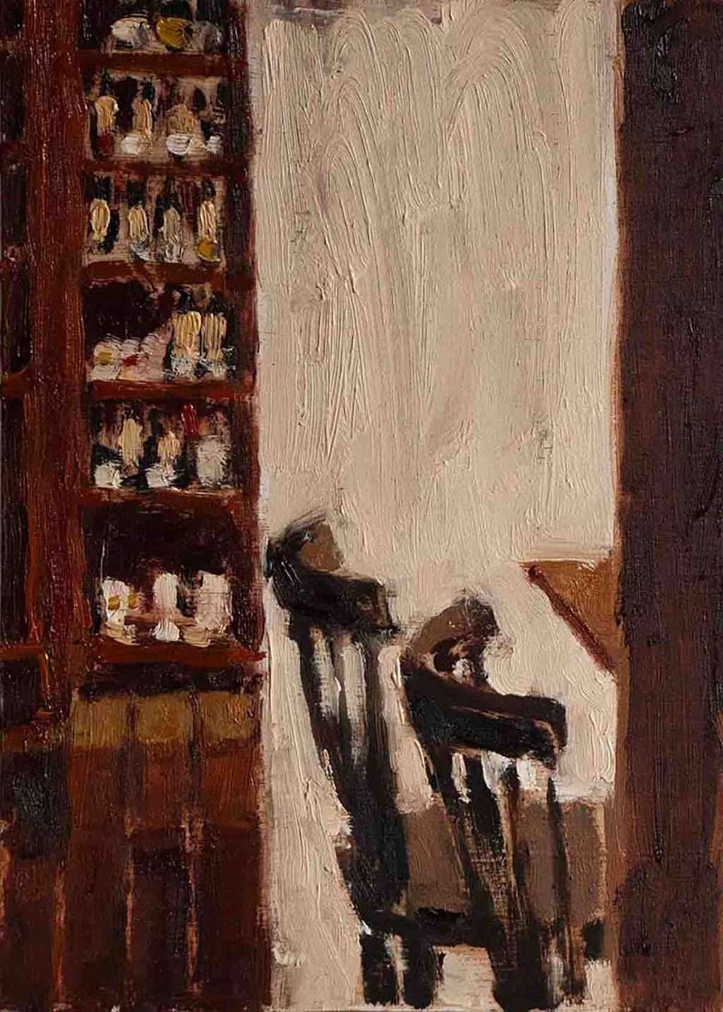 Each silent, uninhabited ‘domestic’ scene is bathed in a muted, colour palette, tobacco and terracotta brown with shimmering shadows. From cosy cafés to the homely comfort of Hallway, St. Stephen Street, Stockbridge where we are invited to peek through the open front door, across the hall towards the lounge with Cheese plant and armchair at the window.