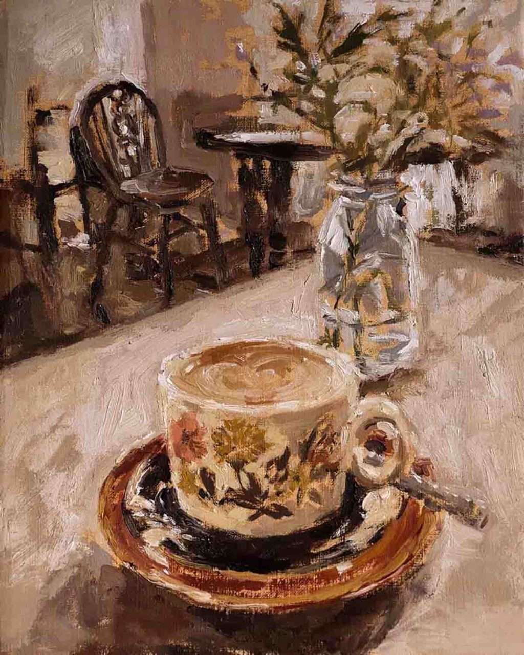 Caroline’s compositional style is greatly influenced by Édouard Vuillard and Gwen John, who was renowned for delicate portraits and still-life. One critic described her work in the realm of ‘interior fever’, taking hold among contemporary artists – as illustrated by John’s painting Interior – a cosy domestic setting with teapot, newspaper and book on a table beside the fireplace