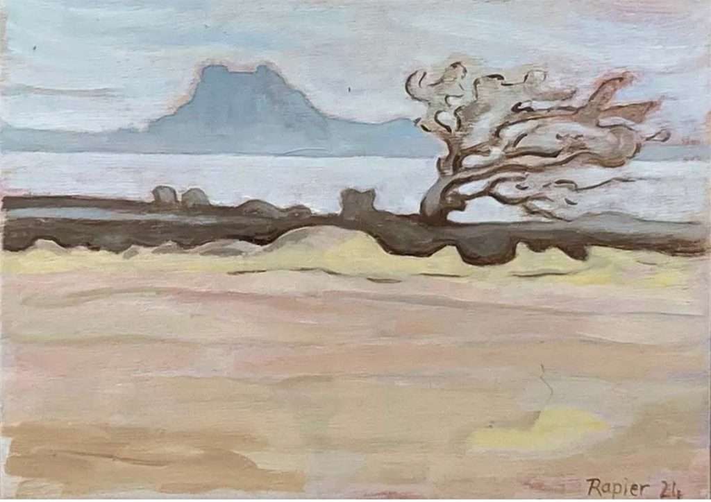 One can immediately see how Audrey is ‘inspired by line and form, working with shapes, colours and the effects of light’. As a free flowing, impressionistic composition, Northumberland Coast is almost distilled to a simple ‘sketch’ while the windswept tree and quirky contour of the distant mountain capture a melancholic mood.