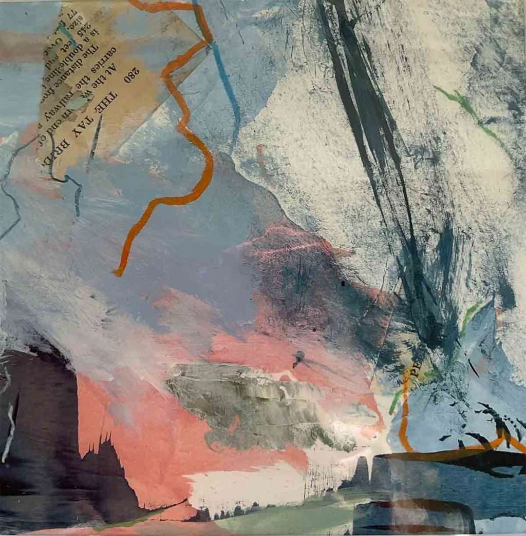 This mesmerising maze of shadowy shapes, sharp edges and curving lines seems to be a haphazard, abstract pattern in a wild splash of white, coral and blue. But the finely-textured surface reveals the imagery of rocky terrain, moss-green shoreline, swirling cloud, translucent water and shaft of sunlight. Janette often interweaves collage for layering and depth; here a scrap of paper with the title, The Tay Bridge, from a vintage Scottish travel book, is embedded into the paint to enhance the character of the landscape. Perceptively and imaginatively observed to evoke the softly shimmering, ebb and flow of the Firth with a meditative, atmospheric sense of place.