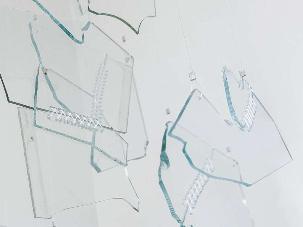 Kate Cameron Reid formerly worked in the professional fashion industry on Savile Row, London. Her installations are primarily autobiographical, often utilising personal belongings or found objects as a metaphor to draw the viewer into her work, recreating a narrative such as Broken Glass. A tall frame is suspended with threaded sharp shards of fractured glass, sourced from abandoned houses in the Highlands.