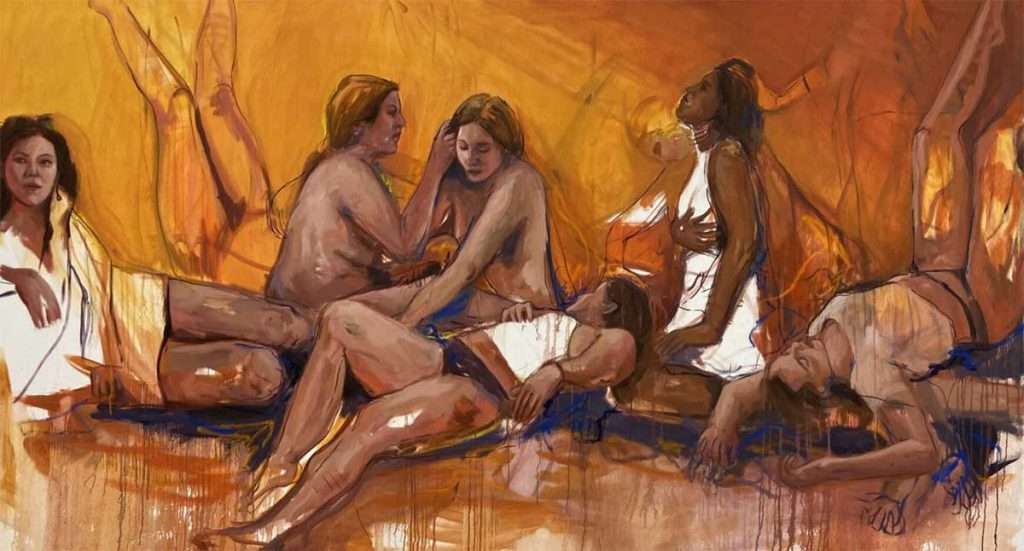Blending classic tradition with modern manner, Josephine invites us to be a voyeur and study the underlying narrative of gender issues and feminine sexuality. The girl on the left poses in confident manner, gazing directly at the viewer; others lie back as if sunbathing, one clutches her breast, while another strokes her friend’s hair with a caring, caressing touch.