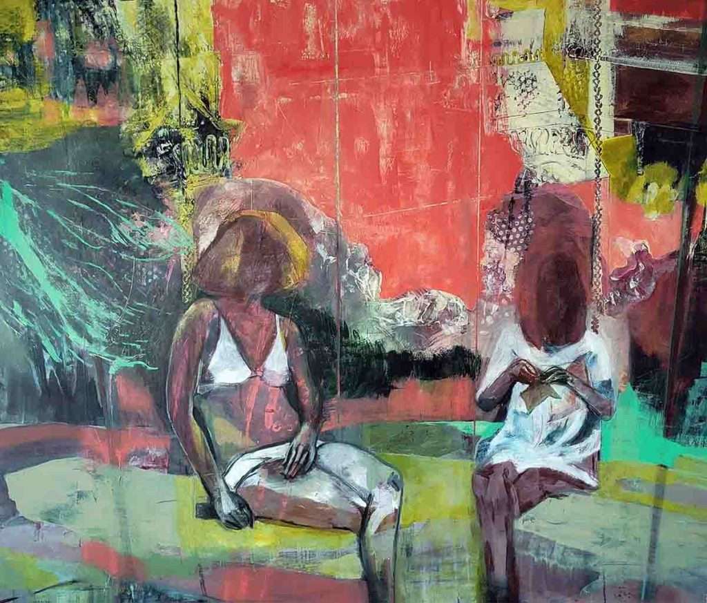 This vividly expressionistic portrayal of two young women bursts with summer warmth in a lush green garden, as they lounge languidly in the sunshine. As Marcoux describes, ‘these figures symbolise the mystery that young women possess often without realising it’. Their faces are intriguingly left blank, no eyes, mouth or nose, echoing the style of portraiture by Vanessa Bell, who represented a person’s character through physical form and emotional mood. The use of a bold colour palette in blocks and streaks with textured layers is akin to old peeling wallpaper – the evidence of past lives and stories.