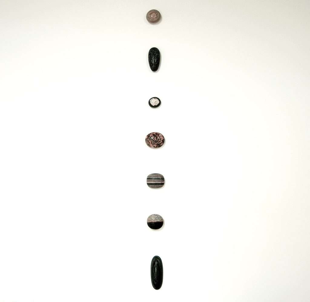 Harvey’s No vestige of a beginning/No prospect of an end is a quotation from Hutton’s seminal work Theory of the Earth (1788). Fifteen gneiss boulders, striated, speckled, banded, honed and rough, positioned on top of flat square slabs of dark-grey Caithness slate are arranged in a regularly-spaced grid on the Gallery floor, filling the space, suggesting the space beyond, the island itself.